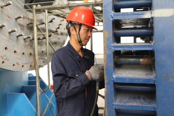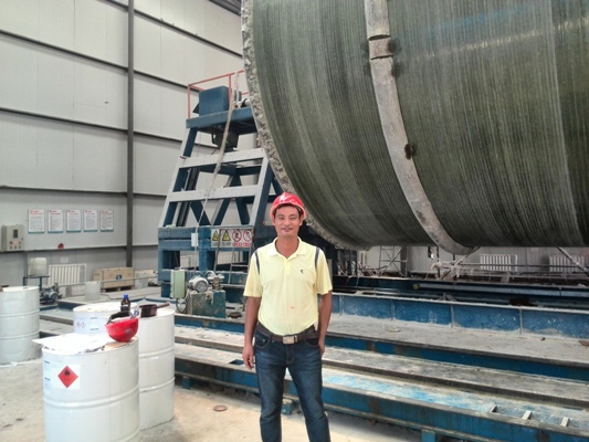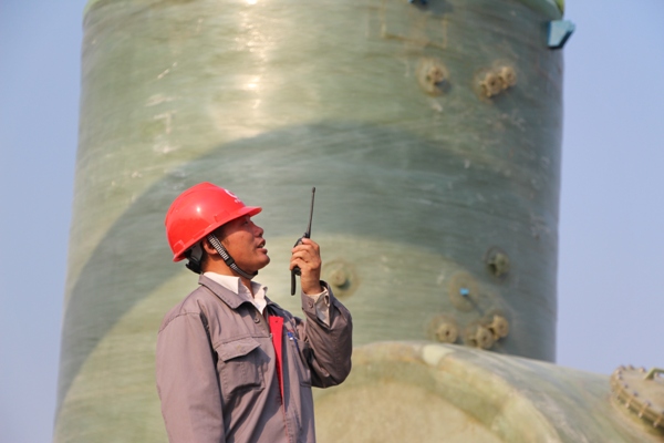 “張斯偉,你們班生產(chǎn)情況如何,有沒有人員中暑?”“報(bào)告熊經(jīng)理,人員一切正常,保證下班前完成MK-09號(hào)罐體纏繞結(jié)束”纏繞班長張斯偉用手抹了一把臉上的汗水答道。 “范成雷,現(xiàn)場情況如何,今晚能否完成1號(hào)平臺(tái)的法蘭對(duì)接?”“報(bào)告熊經(jīng)理,人員一切正常,保證今晚保質(zhì)保量的完成任務(wù)”,手糊二班范成磊回答道。像這樣的詢問和關(guān)心還有很多很多,不管是在室溫高達(dá)四十二度的纏繞車間還是在六十二米高的玻璃鋼煙囪手糊對(duì)接處,你都能看到虎山項(xiàng)目部經(jīng)理熊國慶的身影。