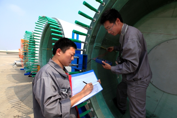 目前中復(fù)連眾生產(chǎn)的葉片最短的有34米,最長的達到超過60米,這就造成擺放這些葉片的場地非常大,連云港生產(chǎn)基地的貨場大約300畝。廣闊的貨場繞行一周至少需要半個小時,工作內(nèi)容暫且不說,光是每天在貨場上來回走上幾趟,很多人都吃不消,加上酷暑寒冬,風(fēng)吹雨淋,讓人望而生畏。葉片噴漆完畢到等待發(fā)貨這段時間,賈效博會將對葉片進行航空標識、內(nèi)部檢查、后緣厚度、螺栓、葉片翼型檢查、人孔板等14個大類60多小項的檢查,從根部到尖部,從外表面到葉片內(nèi)里,有的需要肉眼觀察,有的需要儀器測量,需要嚴格對照工藝要求,逐項檢查,對檢查到的不合格項還要反饋給相關(guān)部門,請他們處理,然后再進行一輪檢查,直至符合出廠標準。遇到發(fā)貨時間比較急,或者是出口訂單,他的任務(wù)就更艱巨了,加班加點不說,對同一只葉片他要看好幾次,確認沒有問題了,他才會給客戶監(jiān)理看。